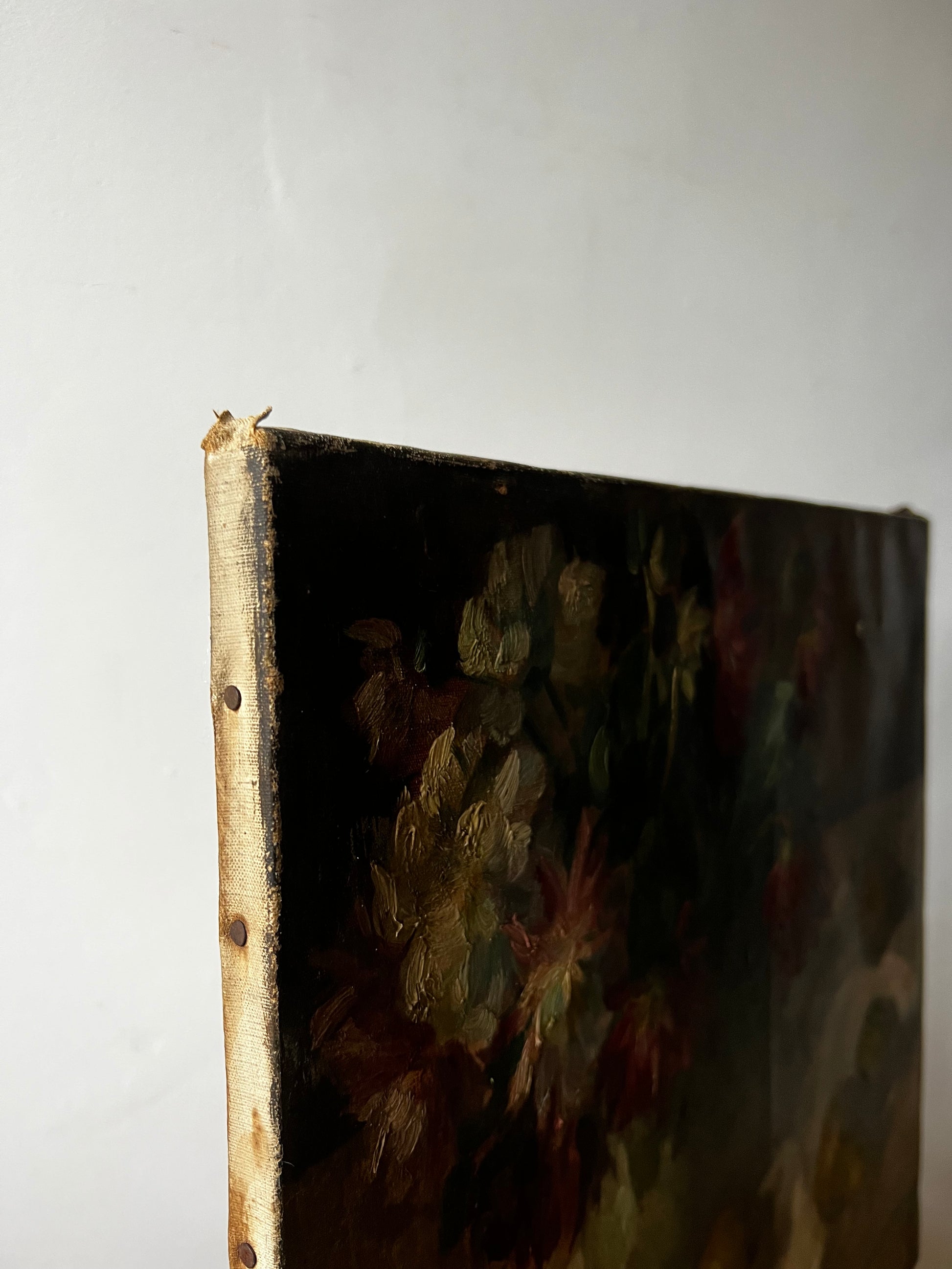 There has been a repair to the back where there are two small holes. This didn’t stop me buying it at all as its such a lovely painting. Also the colour could easily be touched in