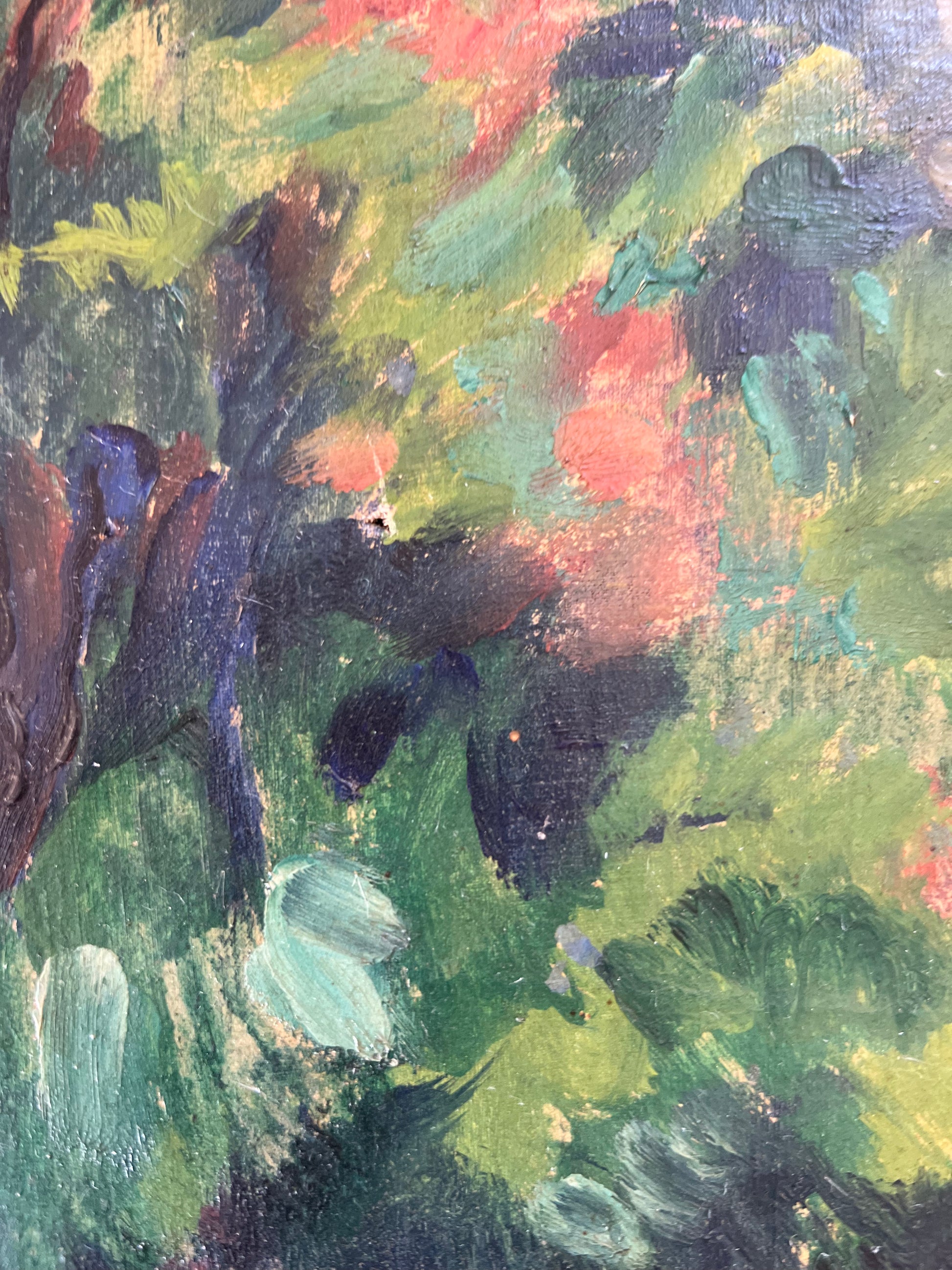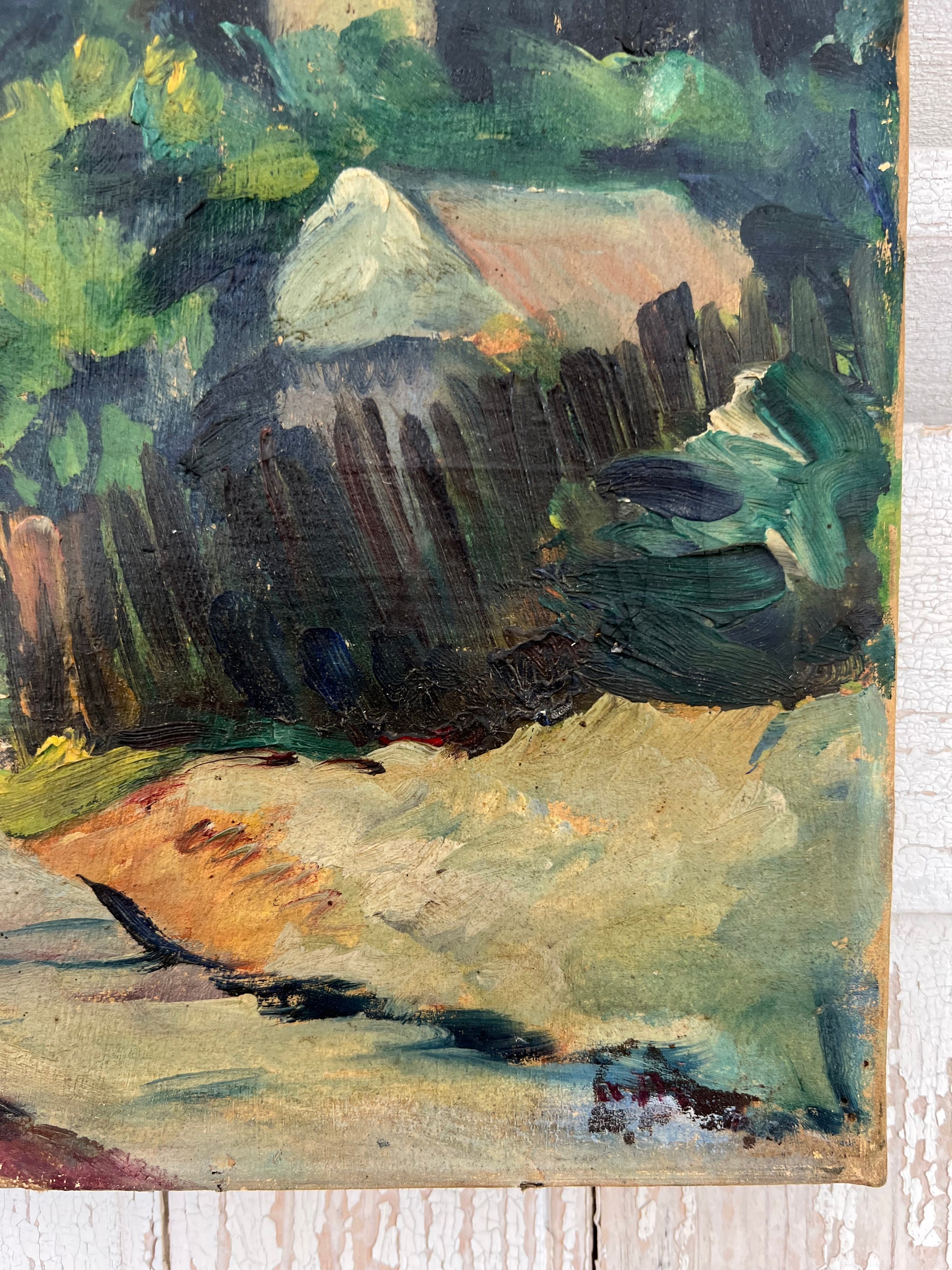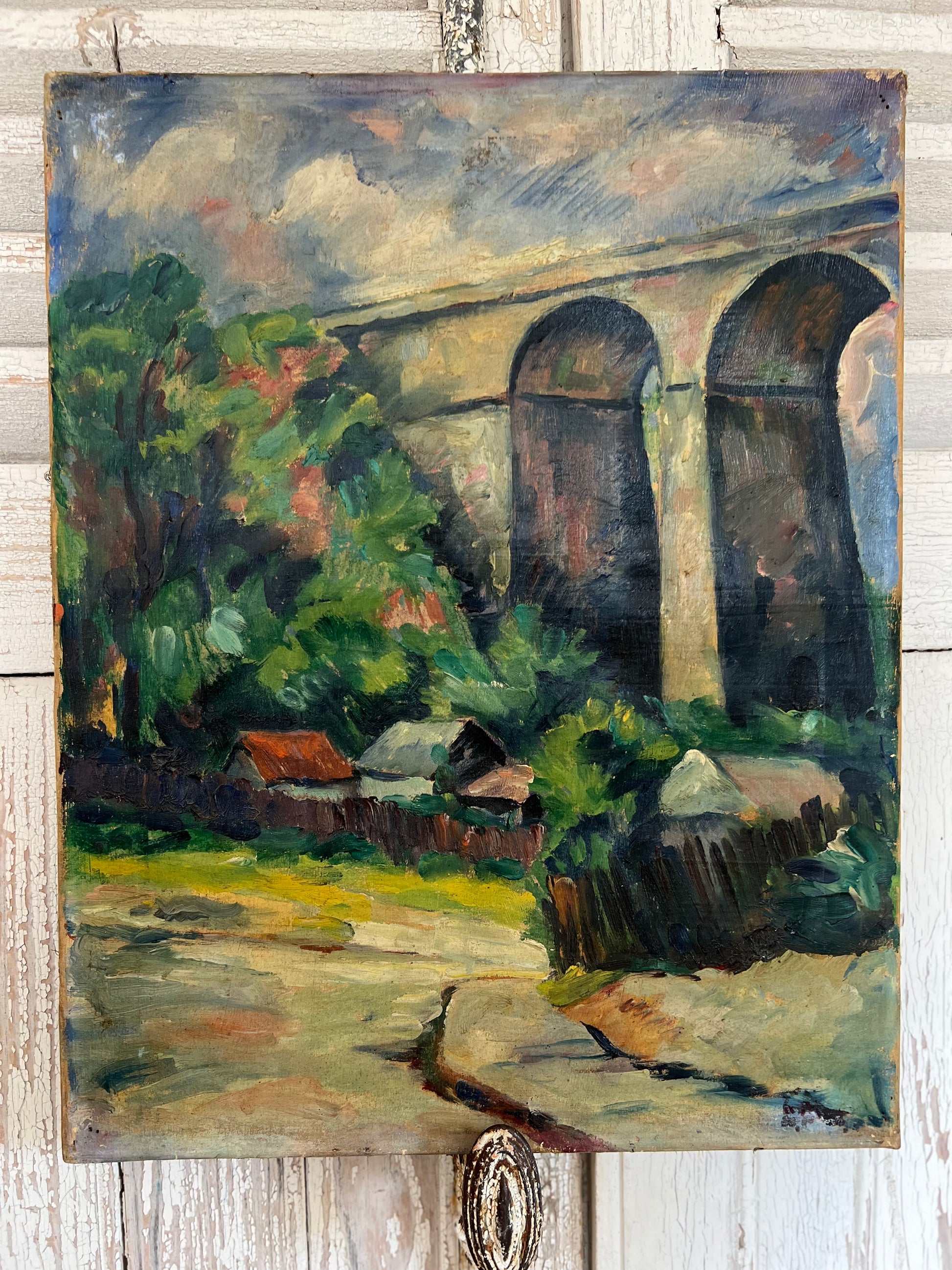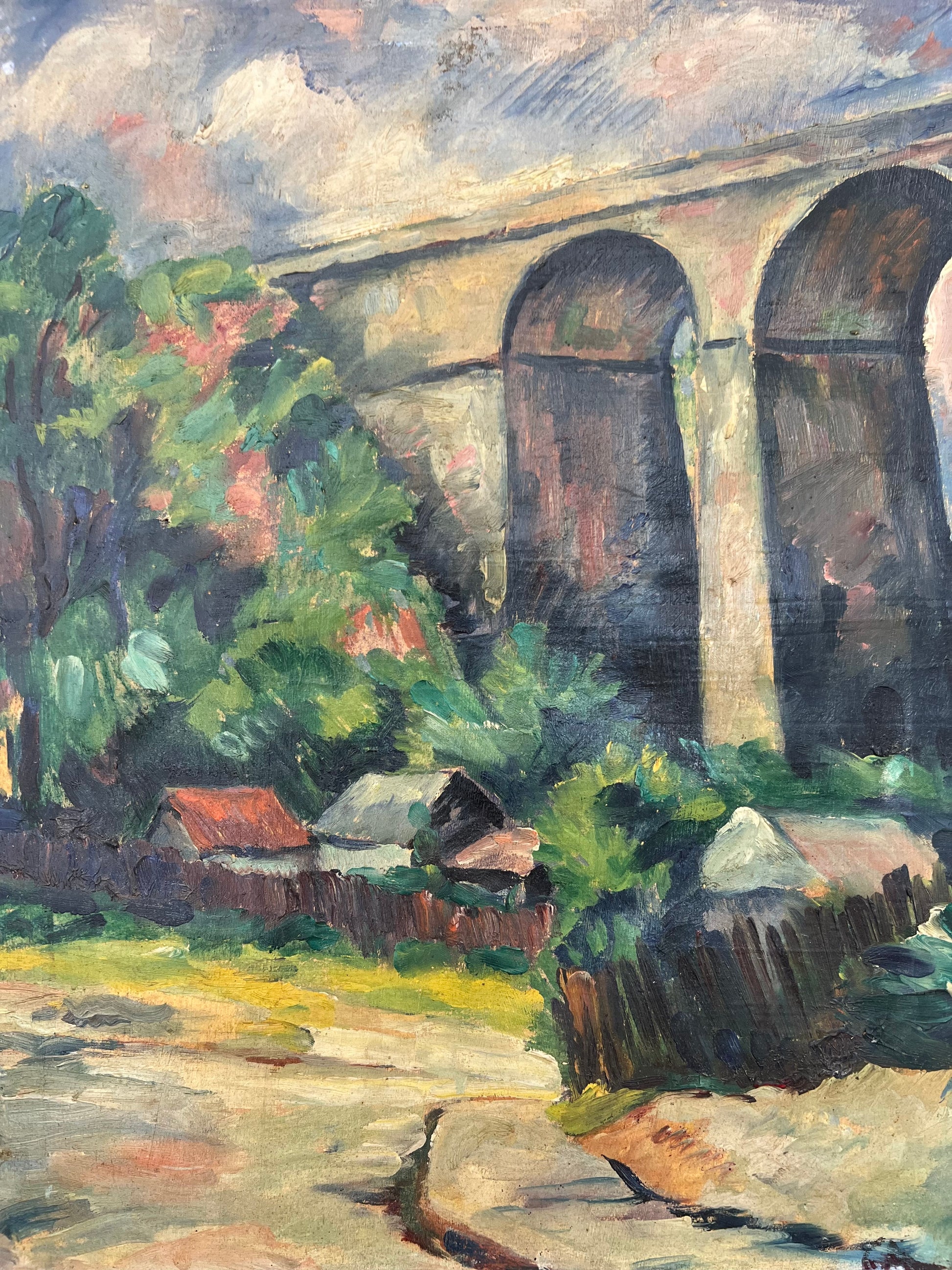 French Oil on Canvas Painting by Edouard Alluaud 1930’s ‘Viaduct Cottages’