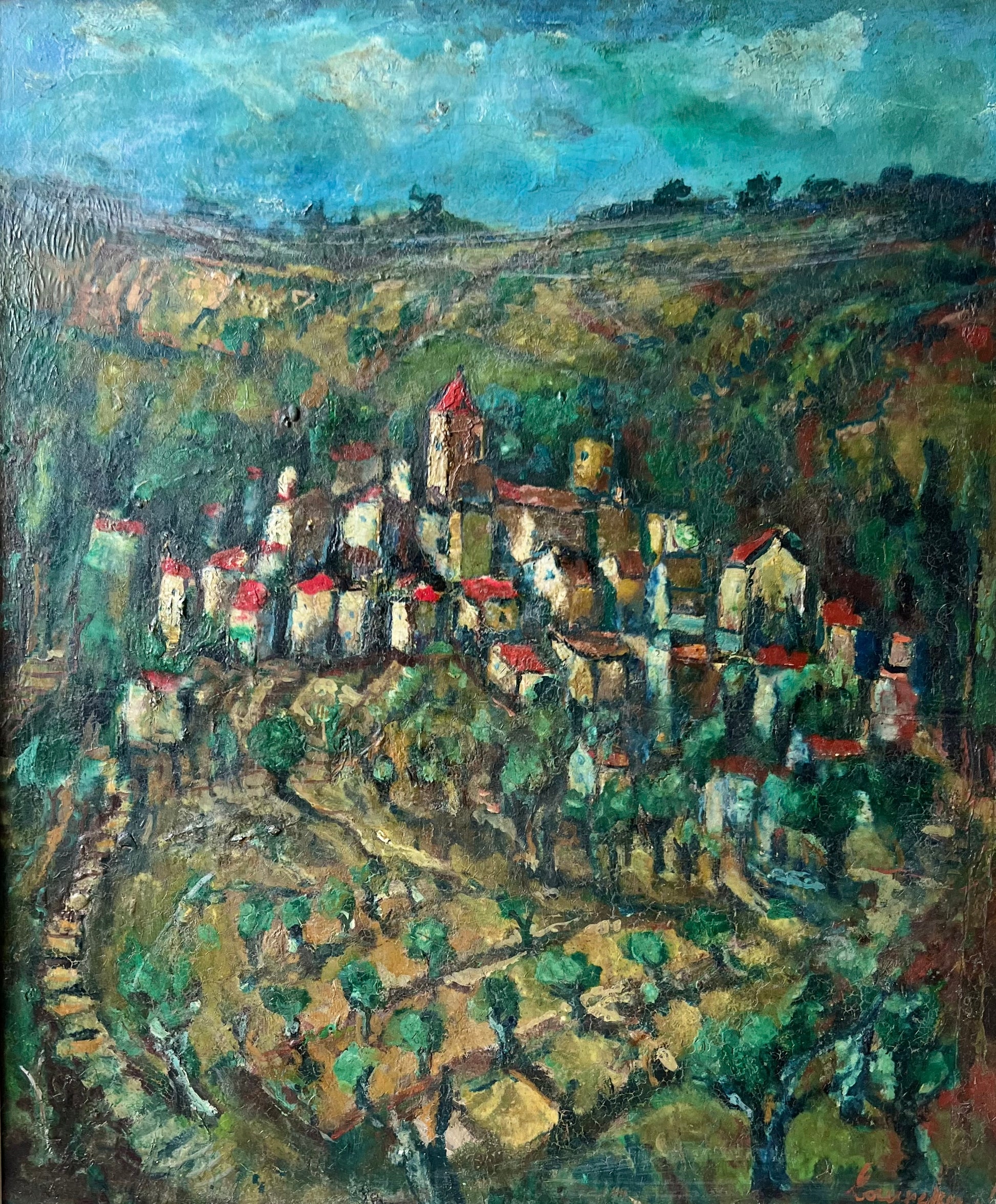 Large Provence Oil Painting of a Hilltop Village & Vineyard 1920