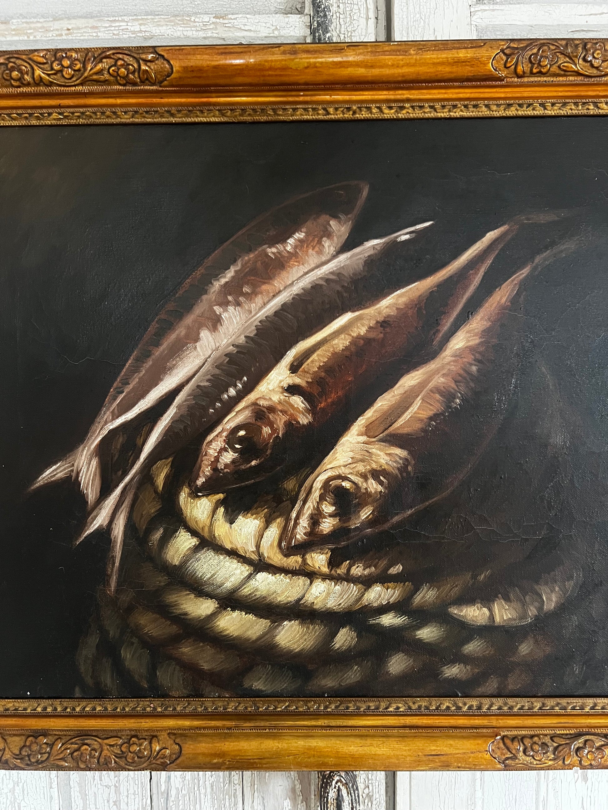 Large Vintage French Oil on Canvas Still Life Painting of Fish