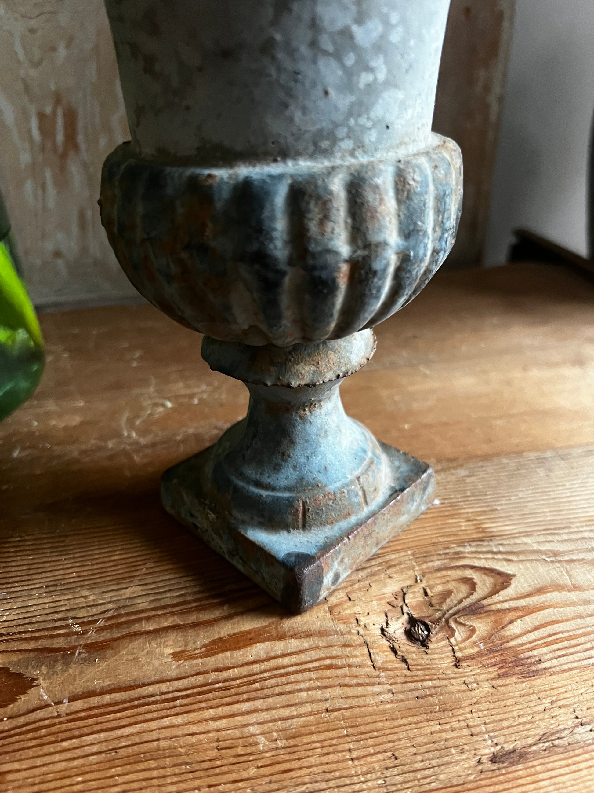 This lovely french metal urn stands 20 cm tall and 15 cm wide.